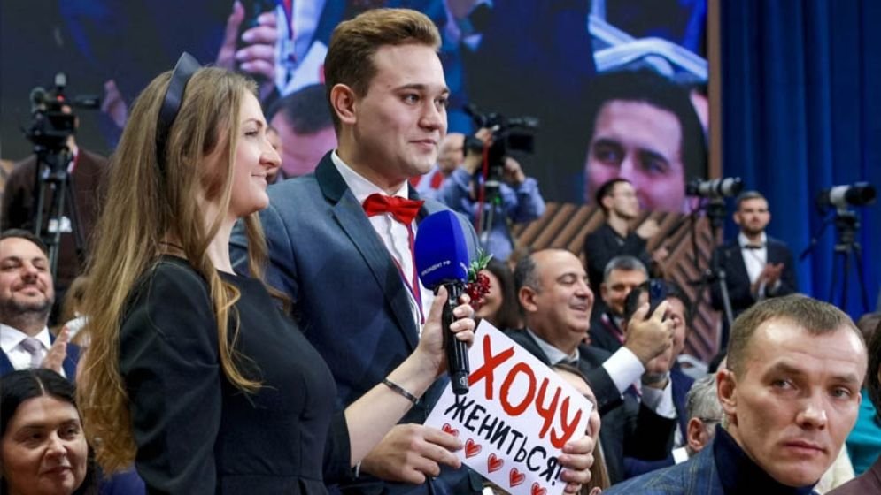 মস্কোতে রাশিয়ার প্রেসিডেন্ট ভ্লাদিমির পুতিনের বার্ষিক লাইভ টেলিভিশন ভাষণ বা টিভি-ম্যারাথন অনুষ্ঠানে ঘটে গেল এক অকস্মাৎ রোমান্টিক ঘটনা, যা বিশ্বব্যাপী মানুষের মন কাড়ছে এবং সামাজিক যোগাযোগ মাধ্যমে ব্যাপক আলোচনার জন্ম দিয়েছে। সেই অনুষ্ঠানের মাঝেই এক তরুণ রুশ সাংবাদিক হাত তোলা পোস্টার নিয়ে প্রেমিকাকে বিয়ের প্রস্তাব দিয়ে বসেন, যা দর্শকদের কাছে এক মনোমুগ্ধকর মুহূর্ত সৃষ্টি করেছে।