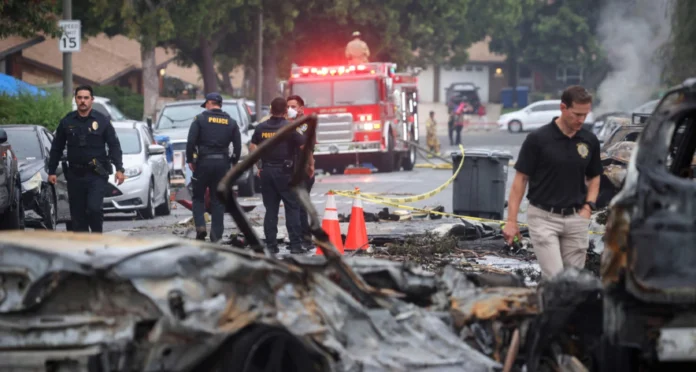 বিধ্বস্তের ফলে সৃষ্ট আগুনে অন্তত ১৫টি বাড়ি ও গাড়ি পুড়ে গেছে। স্থানীয় ফায়ার সার্ভিসের সহকারী প্রধান ড্যান এডি জানান, ঘটনাস্থলে একটি “বিস্তৃত ধ্বংসস্তূপের ক্ষেত্র” তৈরি হয়েছে।