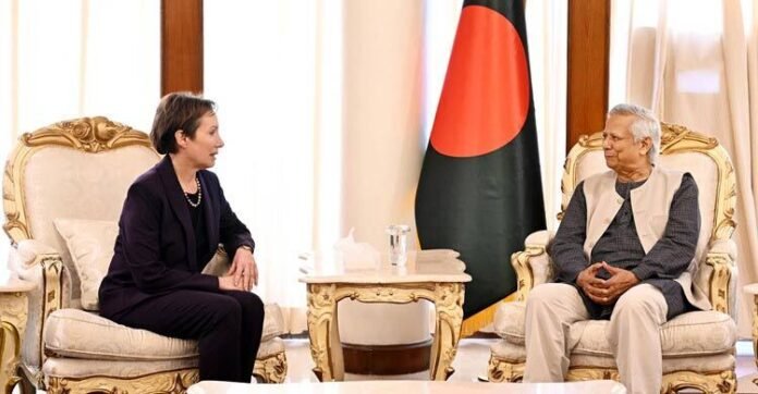 ২৮ জুলাই ২০২৫ — আজ ঢাকায় নিযুক্ত যুক্তরাষ্ট্রের ভারপ্রাপ্ত রাষ্ট্রদূত Tracey Ann Jacobson-এর সাথে সৌহার্দ্যপূর্ণ বৈঠকে অংশ নেন বাংলাদেশের অন্তর্বর্তী সরকারের প্রধান উপদেষ্টা ড. মুহাম্মদ ইউনূস। তিনি বৈঠকে স্পষ্টভাবে জানান, সন্ত্রাস ও সন্ত্রাসবাদ সম্পর্কে সরকারের নীতি হলো ‘জিরো টলারেন্স’। এ প্রত্যয় তিনি শ্রম ও নিরাপত্তার পরিকল্পনা এবং নির্বাচনী প্রস্তুতি আলোচনার প্রেক্ষিতে ব্যক্ত করেন।