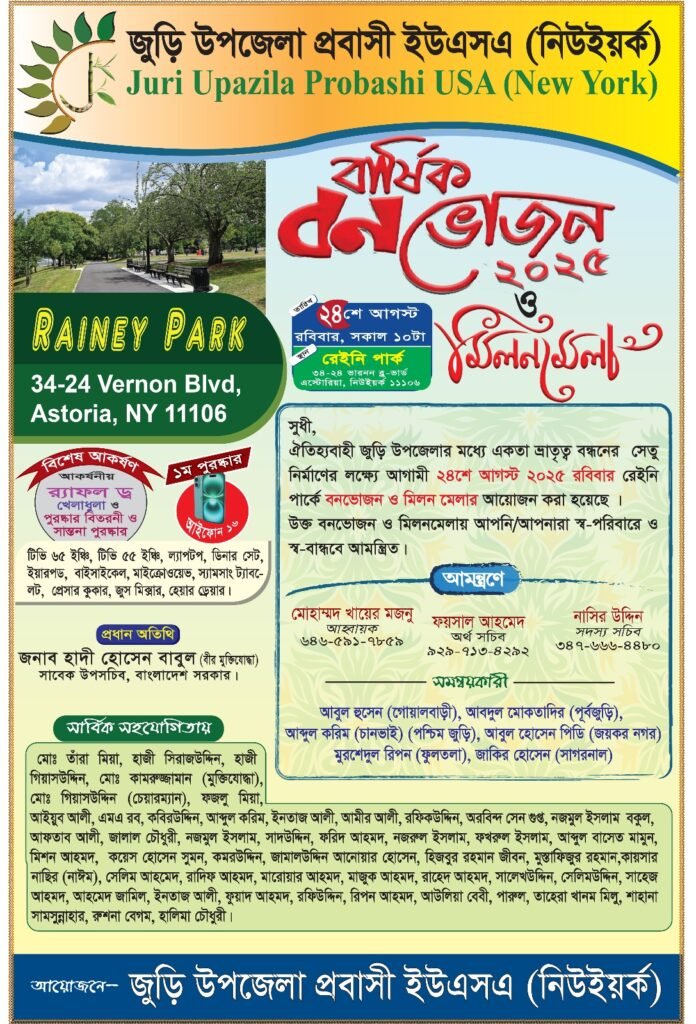 নিউ ইয়র্ক ও আশপাশের সব জুরি উপজেলা প্রবাসী ও তাদের পরিবার নিয়ে এই দিনটি আনন্দ, বন্ধন ও স্মৃতিতে ভরপুর হবে। এটি শুধু একটি উৎসব নয়, বরং একটি আত্মার উদযাপন, যেখানে আমরা একত্রে জড়ো হয়ে একে অপরকে আপন করে নেব।