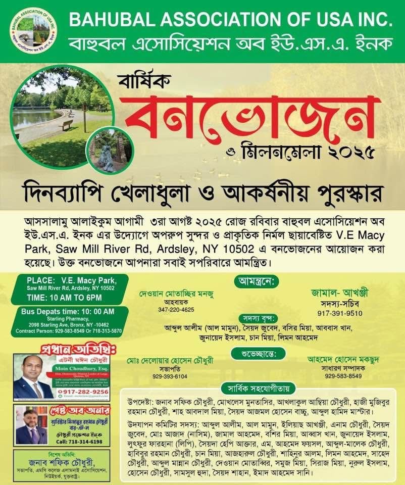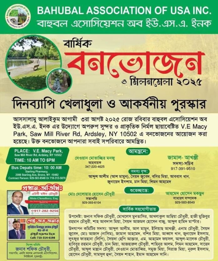 নিউইয়র্কে বসবাসরত বাহুবলবাসীদের জন্য আবারও ফিরে আসছে বহু প্রতীক্ষিত বার্ষিক বনভোজন ও মিলনমেলা ২০২৫।