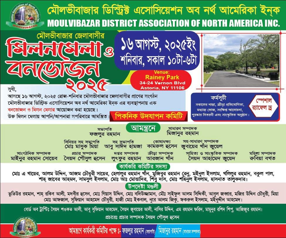 নিউ ইয়র্কসহ আশেপাশের সব প্রবাসী মৌলভীবাজারবাসী ও তাদের পরিবারকে নিয়ে দিনটি আনন্দে, বন্ধনে ও স্মৃতিতে ভরে উঠবে। এটি শুধুই একটি বনভোজন নয়, বরং একটি আত্মার উৎসব, যেখানে আমরা একসাথে হই, একে অপরকে আপন করে নেই।